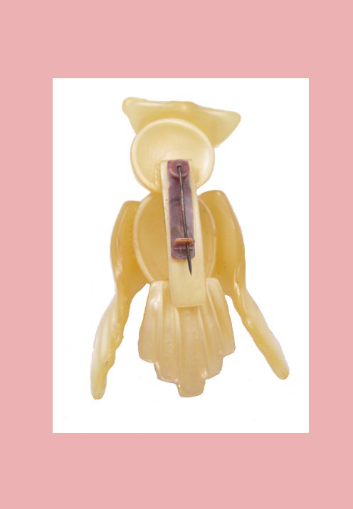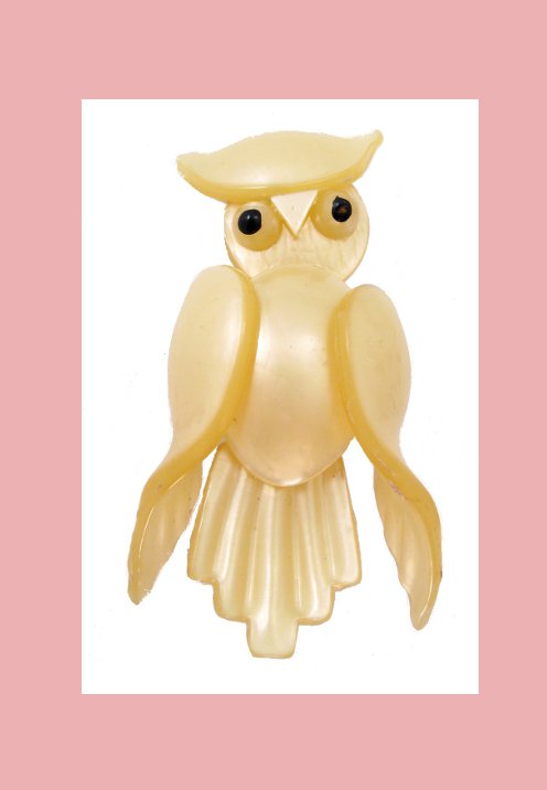 Yellow pastel pearlized lucite has been shaped into an adorable owl pin. His eyes are painted black and his tail curves to have the appearance of feathers. Measures 3" by 1-3/4". Excellent condition.