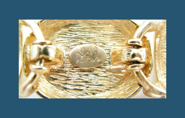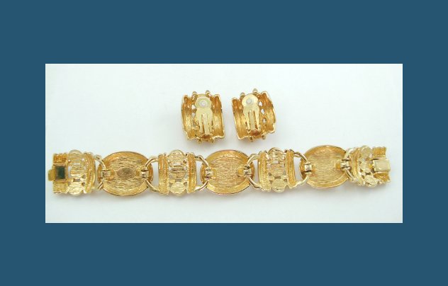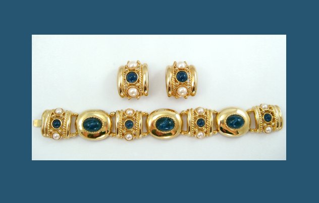 Dark sapphire blue glass cabochons with white whisps decorate this stunning bracelet and earring set from Joan Rivers. With a golden setting, these cabochons create a bold display with plastic pearls as their partners. Bracelet and earrings are signed Joan Rivers, bracelet measures 7-1/4" by 7/8" with push-in clasp, earrings measure 1-1/4" by 7/8" with clip backs. Excellent condition.