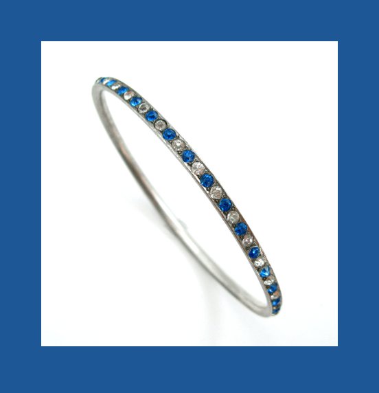 Alternating sapphire blue and clear rhinestones line this dazzling sterling silver bracelet. Each rhinestone is securely bead set. Marked sterling, inside circumference 7-1/2", width 1/8". Excellent condition.