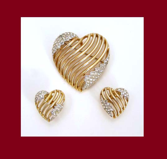Rhinestone Heart Pin and Earrings